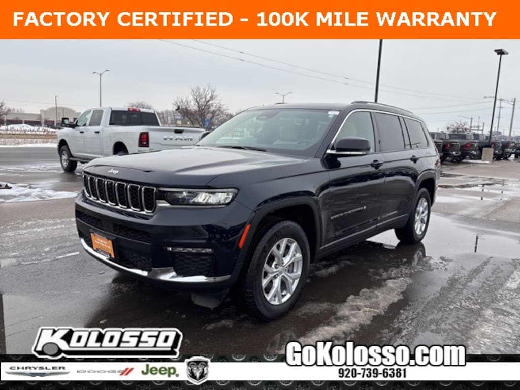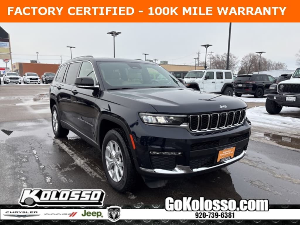 Recent Arrival! Certified. FACTORY CERTIFIED 7 YEAR/100K MILE WARRANTY, Grand Cherokee L Limited, 4D Sport Utility, 3.6L V6 24V VVT, 8-Speed Automatic, 4WD, Midnight Sky, Wicker Beige/Black Artificial Leather, 2nd Row Manual Window Shades, Auto-Dimming Exterior Driver Mirror, Capri Leatherette w/Axis II Seats, Dual-Pane Panoramic Sunroof, Emergency communication system, Heated front seats, Heated rear seats, Integrated Off-Road Camera, Interior Rear Facing Camera, Intersection Collision Assist System, Low tire pressure warning, Luxury Tech Group II, Memory Steering Column, Navigation System, ParkSense Front/Rear Park Assist w/Stop, ParkView Rear Back-Up Camera, Passive Entry - Front/Rear Doors, Liftgate, Power Liftgate, Power passenger seat, Power Tilt/Telescope Steering Column, Quick Order Package 23E, Radio: Uconnect 5 Nav w/10.1" Display, Rain Sensitive Windshield Wipers, Rear Back Up Camera Washer, Rearview Autodim Digital Display Mirror, Steering wheel mounted audio controls, Surround View Camera System, Ventilated Front Seats, Wireless Charging Pad.