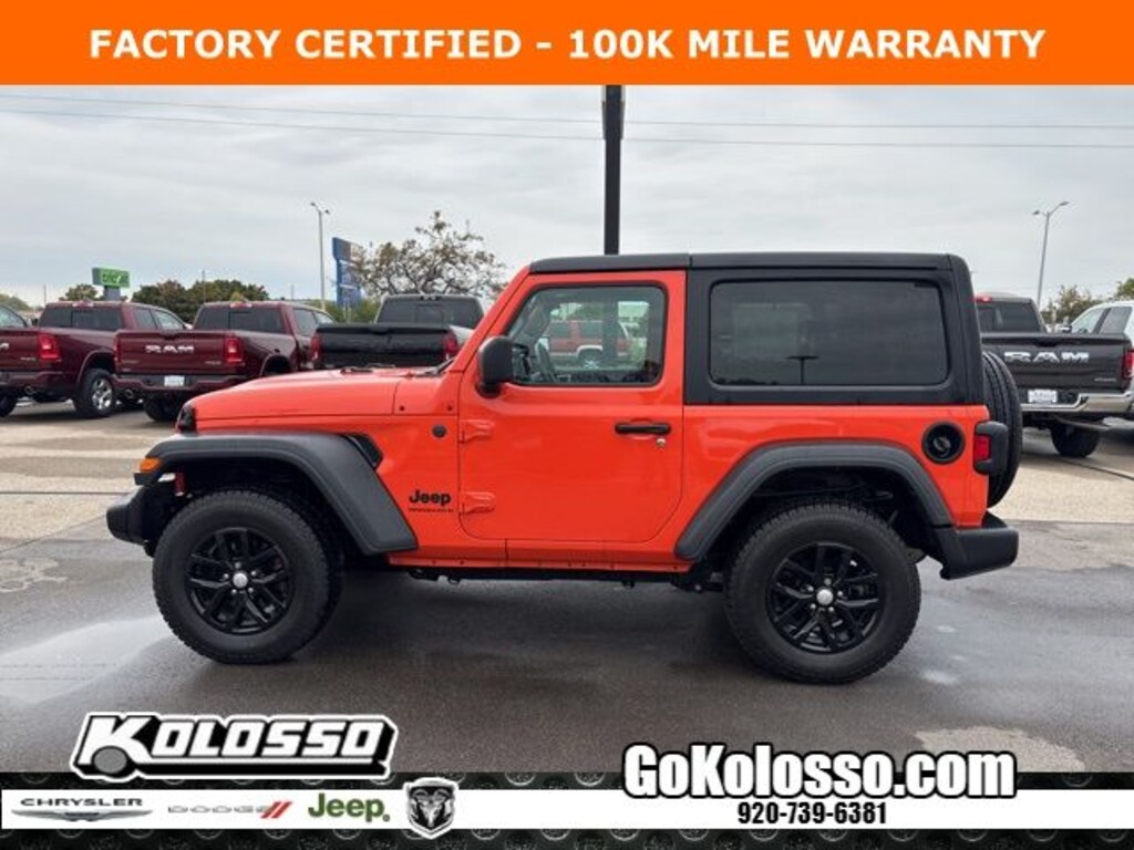 Recent Arrival! Certified. FACTORY CERTIFIED 7 YEAR/100K MILE WARRANTY, Wrangler Sport S, 2D Sport Utility, 2.0L I4 DOHC, 8-Speed Automatic, 4WD, Punkn Metallic Clearcoat, Black Cloth, Apple CarPlay/Android Auto, Automatic Headlamps, Black 3-Piece Hard Top, Cold Weather Group, Convenience Group, Deep Tint Sunscreen Windows, Emergency communication system: SiriusXM Guardian, Freedom Panel Storage Bag, Front 1-Touch Down Power Windows, Heated Front Seats, Heated Steering Wheel, Low tire pressure warning, No Soft Top, ParkView Rear Back-Up Camera, Power Heated Mirrors, Premium Wrapped Steering Wheel, Quick Order Package 22S Sport S, Rear Window Defroster, Rear Window Wiper/Washer, Remote Keyless Entry, Remote Start System, Security Alarm, Speed Sensitive Power Locks, Sport S, Sun Visors w/Illuminated Vanity Mirrors, Universal Garage Door Opener, Wheels: 17" x 7.5 Tech Silver Aluminum.