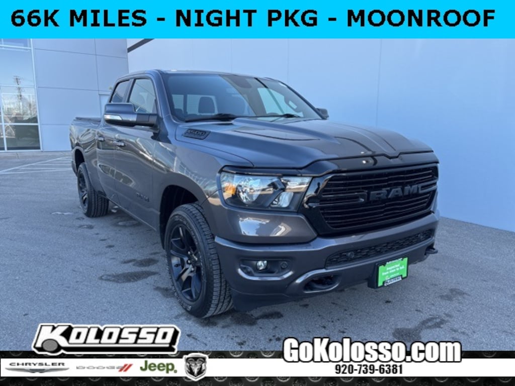 Recent Arrival! Certified. 1500 Big Horn/Lone Star, 4D Quad Cab, HEMI 5.7L V8 Multi Displacement VVT, 8-Speed Automatic, 4WD, Granite Crystal Metallic Clearcoat, Black Cloth, 115V Auxiliary Power Outlet, 115V Auxiliary Rear Power Outlet, 2 USB Full Function/Charge Only Media Hub, 400W Inverter, Air Conditioning ATC w/Dual Zone Control, Anti-Spin Differential Rear Axle, Auto-Dimming Exterior Driver Mirror, Auto-Dimming Rear-View Mirror, Big Horn IP Badge, Big Horn Level 2 Equipment Group, Black Exterior Truck Badging, Black Headlamp Bezels, Black Interior Accents, Black Premium Power Mirrors, Body Color Door Handles, Body Color Exterior Mirrors, Body Color Front Bumper, Body Color Premium Power Mirrors, Body Color Rear Bumper w/Step Pads, Class IV Receiver Hitch, Cluster 7.0" TFT Color Display, Dampened Tailgate, Deluxe Cloth Bucket Seats, Dual Exhaust w/Black Tips, Exterior Mirrors Courtesy Lamps, Exterior Mirrors w/Memory, Foam Bottle Insert (Door Trim Panel), Glove Box Lamp, Grille Surround 1 Black Texture 2 Black, Heated Front Seats, Heated Steering Wheel, Night Edition, ParkSense Front/Rear Park Assist w/Stop, Power 4-Way Driver Lumbar Adjust, Power 8-Way Driver Seat, Power Adjustable Pedals, Power-Folding Mirrors, Protection Group, Quick Order Package 25Z Big Horn, Radio: Uconnect 4 w/8.4" Display, Rear Dome w/On/Off Switch Lamp, Rear Power Sliding Window, Rear Window Defroster, Security Alarm, SiriusXM Satellite Radio, Sun Visors w/Illuminated Vanity Mirrors, Tow Hooks, Universal Garage Door Opener, Wheels: 20" x 9.0" Premium Paint/Polished.