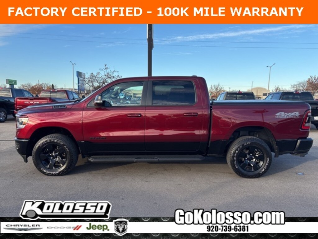 Certified. FACTORY CERTIFIED 7 YEAR/100K MILE WARRANTY, 1500 Big Horn/Lone Star, 4D Crew Cab, HEMI 5.7L V8 Multi Displacement VVT, 8-Speed Automatic, 4WD, Delmonico Red Pearlcoat, Black Cloth, 115V Auxiliary Power Outlet, 115V Auxiliary Rear Power Outlet, 2nd Row In Floor Storage Bins, 4G LTE Wi-Fi Hot Spot, 8.4" Touchscreen Display, Accent Color Premium Power Mirrors, Air Conditioning ATC w/Dual Zone Control, All Plant-Installed Decals, Apple CarPlay, Auto-Dimming Exterior Driver Mirror, Auto-Dimming Rear-View Mirror, Back Country I/P Badge, Back Country Package, Big Horn Badge, Big Horn Level 2 Equipment Group, Black Exterior Mirrors, Black Exterior Truck Badging, Black Headlamp Bezels, Black Painted Exterior Mirrors Caps, Black Premium Power Mirrors, Bluetooth Handsfree Phone & Audio, Class IV Receiver Hitch, Cloth/Vinyl Bucket Seats, Cluster 7.0" TFT Color Display, Connectivity - US/Canada, Convex Wide-Angle Mirror Insert, Dual Exhaust w/Black Tips, E-Locker Rear Axle, Exterior Mirrors Courtesy Lamps, Exterior Mirrors w/Heating Element, Exterior Mirrors w/Supplemental Signals, For Details, Visit DriveUconnect.com, Front Extra HD Shock Absorbers, Front LED Fog Lamps, Global Telematics Box Module (TBM), Glove Box Lamp, Google Android Auto, GPS Antenna Input, Grille Surround 1 Body Color Texture 1 Black, Heated Front Seats, Heated Steering Wheel, Hill Descent Control, Integrated Center Stack Radio, LED Reflector Headlamps, LED Taillamps, Media Hub w/2 Charge Only USBs, MOPAR 4 Adjustable Cargo Tie-Down Hooks, Mopar Black Tubular Side Steps, MOPAR Deployable Bed Step, MOPAR Front & Rear Rubber Floor Mats, MOPAR Spray In Bedliner, Off Road Decals, Off-Road Information Pages, Painted Front Bumper, Painted Rear Bumper, ParkSense Front/Rear Park Assist w/Stop, Pick-Up Box Lighting, Power 2-Way Driver Lumbar Adjust, Power 8-Way Driver Seat, Power Adjustable Pedals, Power-Folding Mirrors, Premium Lighting Group, Quick Order Package 27Z Big Horn, Radio: Uconnect 5 W w/8.4" Display, Raised Ride Height, RAM Grille Badge - Black, Rear Dome w/On/Off Switch Lamp, Rear Extra HD Shock Absorbers, Rear Power Sliding Window, Rear Window Defroster, Remote Start System, Security Alarm, SiriusXM Radio Service, SiriusXM Satellite Radio, Sun Visors w/Illuminated Vanity Mirrors, Tow Hooks, Tri-Fold Tonneau Cover, Universal Garage Door Opener, USB Host Flip, Wheels: 18" x 8.0" Black Painted Aluminum.